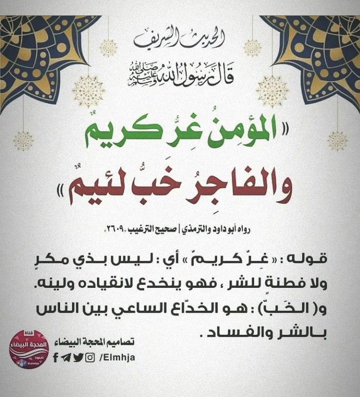 تەرجىمىسى: «مۇئمىن – كۆڭلى تۈز، ساددا (باشقىلارغا ئاسان ئىشىنىدىغان) ۋە كەرەملىك (مەرد) بولىدۇ؛ پاسىق (مۇناپىق) بولسا – ھىلىگەر، مەككار ۋە پەسكەش بولىدۇ.»